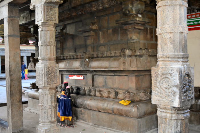 The Second Prakara The second prakara has a gopura entrance. The gopura is a two tier structure raised on a upapitha. It is sectioned as karna patthis in the corners and sala patthi in the middle. On the either side, Dvarapalas adorn the niches formed in between the karna and sala patthis. Above the upapitha is the padabandha adhishthana, the wall above the adhishthana is adorned by brahmakanta pilasters. In between the wall and the adhishthana is the vedika complex with usual elements. The pilasters carry upper ornamentation of kalasa, tadi, kudam, pali, palakha and virakanda. The vettu potikas above the pilasters extend the limbs to bear the uttira. Above the uttira is the vajana, valabhi and kapota. The valabhi is ornamented as padma series. The kapota is adorned with kudu at frequent intervals. Above the kapota is the bhumidesa denoting the end of the tala. The super structure is rich in stucco figures depicting the various puranic themes. ![]() Main Vimana Above the vedika is seen the hara of the first tala. It consists of the kutas in the corners and sala in the middle. The harantara connects the hara elements, besides kshudra nasikas seen in the harantara. All these elements have stucco figures in their nasikas. The harmaya of the second tala raises behind the hara. The wall of the harmaya is sectioned by brahmakantha pilasters and the potikas are angular. The prastara includes the usual elements and the valabhi is decorated with equidistantly placed madalai. The overhanging kapota has kudu arches. The bhumi desa is represented by a short wall. The vedika rests on the roof of the harmya of the second tala has ganas and the vahanas in all the four corners. The wall of the griva has brahma kantha pilasters in all the corners that support the usual prastara elements. The valabhi is adorned with madalai. The griva has four mahanasikas facing the cardinal directions and four more as alpa nasikas, two on the east and two on the west. On the eastern side, either side of the mahanasikas are depicted with Dvarapalas. Vinayaka and Muruga are shown in the alpa nasikas. The mahanasika on the north and south has Brahma and Dakshinamurthi respectively. The mahanasika on the west is empty. All the four corners possess a gana in the middle flanked by Nandi. The Sala shikara crowns the gopura and has a row of stupis in its summit. The compound wall extends on both the sides and encompasses the prakara. The entrance in the gopura leads to the inner prakara. Inside, in the centre of the prakara lies the shrine of Thirunedungala nathar, in the southwest corner of the prakara lies the Valamburi Vinayagar shrine facing east, in the northern side of the prakara lies the shrine of Agasthiya Linga facing east and the Chandeswara shrine facing south. A well called Agasthiya thirtha lies near the Chandeswara shrine. Except eastern side, the thiruchurru malika runs in all directions along the compound wall. ![]() Tiruchutru-North Side ![]() Tiruchutru-South Side The thiruchurru malaika has a upapitha with a row of pillars in the periphery. On the western side the thiruchurru possess two rows of pillars. The pillars on the northern side are rudra, whereas the pillars on the western and southern side are sectioned as three squares with kattu in between. In addition the pillars on the southern side are further ornamented with a band in the middle of the kattu and padmakattu flanking the squares. The potikas above the pillars on the north and the west are vettu whereas the potikas on the southern side are madalai and nunudal. The potikas bear the uttira and above the uttira is the vajana and valabhi. Stone slabs cover the roof of the thiruchurru and also finished with cement plastering. Sculptures of Chandeswara, Virabhadra, Saptamatas, Ganesa, and a panel of Saptamatrikas are seen on the southern side of the perambulation. The Subrahmania shirne is located on the western side in the thiruchurru. Besides, sculptures of Siva and Parvathi, Linga, Ganesa and few broken sculptures are kept here. In the north western corner of the thiruchurru is seen the shrine of Sri Varadharaja Perumal. Next to the shrine is seen the sculpture of Jeyeshta. Various vahanas are kept on the northern side of the thiruchurru. ![]() Valampuri Vinayagar Shrine The Valamburi Vinayagar Shrine The Valamburi Vinayagar Shrine consists of a vimana and a mukhamandapa. The vimana is a single tier structure with an adhishthana, bhitti, prastara, nagara sikhara and stupi. It has pratibandha adhishthana in which only the rudra kumuda and the prati series alone visible, the rest are inhumed in the later paved stone flooring. In the yazhi series the corners are adorned with makara heads. The wall is sectioned by brahmakantha pilasters. The pilasters possess upper ornamentation of kattu, kalasam, tadi, kudam, pali, palakha and virakantha. The potikas above the pilasters are angular and bear the uttira. Above the uttira is the vajana, valabhi. The flexed over hanging kapota possess kudus at frequent intervals. Above the kapota is the bhumidesa denoting the end of the tala. The griva and sikhara rests on the vedika. The griva has brahmakantha pilasters at the corners bearing the usual prastara elements. Instead of mahanasikas, the kirti mukhas are seen on all the sides except east and adorned with Ganesa in seated form. Above the sikhara is the stupi. The mukha mandapa carry the same segmentation as seen in the tala of the vimana. On the roof of the mukha mandapa Ganesa is shown inside an arched niche above the entrance and flanked by Nandi. The sanctum houses Lord Ganesa seated on a pedestal in lalitasana, the back hands carry pasa and angusa and the front hands carry tusk on the right and motaka on the left. The God is adorned with karanda makuta, ornaments and short attire. The Agatthiyar Linga shrine The Agatthiyar Linga shrine consists of a sanctum and a mukha mandapa. The sanctum has padabandha adhishthana, wall sectioned by brahmakanta pilasters a