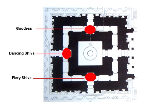 Usually, most types of vimaanas or temple towers raise over and above the four walls that surround the sanctum sanctorum (Garba griha). The Saanthaara vimana is a special type of vimana, in which an outer ambulatory wall is constructed around the garbagriha and the overall vimana is made to rest on two parallal walls instead of one. This arrangement enables the temple architects to extend the overall base area that is available for the vimana. It also helps to distribute the heavy load of vimana on to the floor - using eight walls instead of four walls. In such an arrangement, the gap that is in between the outerwall and the inner wall of the garba griha becomes a circumbulatory passage for the devotees to go around the inner garbagriha. For convenience, we will call the outer wall as the ambulatory wall and the inner wall as garba griha wall. The ambulatory wall should be clearly distinguished from the generic temple enclosure - which surrounds, not just the garbagriha, but the whole temple complex. ![]() Figure - Saanthara Vimana - General Arrangement One of the earliest examples of saanthara vimana construction attempts that survives till date, can be found at Adhyantha kaama parameswara gruham - better known as the Dharmaraja ratha - of mahamallapuram(1). While the aadhi thala structure of this fine rockcut monolith was never completed, attempts to carve out a circumbulatory passage can be seen on the eastern side of the temple. ![]() Figure - Adhyantha kaamam(Dharmaraaja Ratha) of Mahamallapuram - Efforts to carve out a passage visible in aadhi tala Though such a garba griha construction never became a popular choice of ancient artisans, we do see some marked attempts in places like Kanchipuram (Kailaasanatha and Vaikuntha perumal temples), Thiruppattur (Kailaasanatha temple), Uttiramerur (Sundareswara Temple) and Naarthamalai (Vijayalaya choleeswaram). While the Kanchipuram and Thiruppattur temples were conceptions of Pallava artists, the Naarthamalai temple came out of Muttaraiyar Shilpis. ![]() Figure - Naarthamalai Vijayaalaya choleeswaram. Garbagriha is circular in shape Focussing on specific constructional details of these ambulatory and inner walls, one finds a wide variety of styles being adopted in different places. The inner wall that constitutes the garba griha has atleast one major opening - usually along the eastern direction, so as to provide a view of the main diety. It may or may not have openings - windows or doors - in the other three directions. Similarly, the outer ambulatory wall also has atleast one main opening along the eastern direction - laid symmetrical with the opening on the inner wall. But, unlike garbagriha, it is usually provided with windows and/or doors on all the other three directions, in order to provide ventilation and light to the circumbulatary saantaaram passage. When the inner sanctorum wall as well as the ambulatory wall has door openings on all the four directions, it becomes possible to view the enshrined deity from all the four directions. The Saanthaara Vimana of Raajarajeeswaram and the Circumbulatory passage Raajarajeeswaram, the pinnacle of Chola architecture and the monumental project undertaken by Rajaraja-I the great under the architectural leadership of Kunjara Mallan alias Raajarajap Perunthachchan is bestowed with a saanthara vimaana. The circumbulatory passage that runs between the ambulatory wall and garba griha has attracted international attention because of the Chola era paintings, painted along the lengths and breadths of the walls - on either side. The passage also has three huge icons in all the three directions except east, where the great imposing linga - aptly termed as Raajarajeeswaram udaiya paramaswamin (now called Thanjai Peruvudaiyar) - can be viewed by the devotees. Our focus in the paper, is on these three icons. The ovarall architectural arrangement of the saanthara vimana with its icons represents certain unique aspects that are not seen anywhere else in the country. Infact, Raajarajeeswaram temple - as a whole - boasts many such unique icons and architectural aspects that have been analyzed to some extent in the available treasies. The overall arrangement of garbagriha and circumbulatory passage is represented in the figure below : ![]() Figure - Garba griha and circumbulatory passage architecture of Raajarajeeswaram. Courtesy - Pierre Pichard As shown, the width of passage itself is relatively small when compared to the width of garba griha wall or ambulatory walls. The astounding thickness of these walls is truly justified by the imposing 216 feet srivimana which they have to support. The walls on either side that make up the ambulatory passage are divided equally in all directions and massive paintings adorn the walls. The icons are aligned with the inner wall and are located at the centre of the passage , in each of the three directions. There are three big door openings (or Thiru vayils) flanked by two dwara paalakas (4) - in the center of outer ambulatory wall, in each of the three directions. The icons are located just behind these openings. Thus, if the doors are kept open, these icons can be seen from the outer prakaara. ![]() Figure - Dwarapaalakas or Ayudha bheras on the southern door of Saantharam opening However, one also has to take note of the absense of stone steps in all the three directions. Thus, it is evident that the three openings on the ambulatory wall were not meant to be accessed on a regular basis by one and all. Whether they were meant for special access on certain occations or just meant to provide better light into the circumbulatory passage - we are not sure. Circumbulatory Passage Iconography The passage of Raajarajeeswaram has the following icons - located one in each direction. * A massive stone sculpture - possibly a fierce representation of shiva - on the centre of southern facade, facing south * A massive stone sculpture of dancing shiva, fully painted - on the centre of 