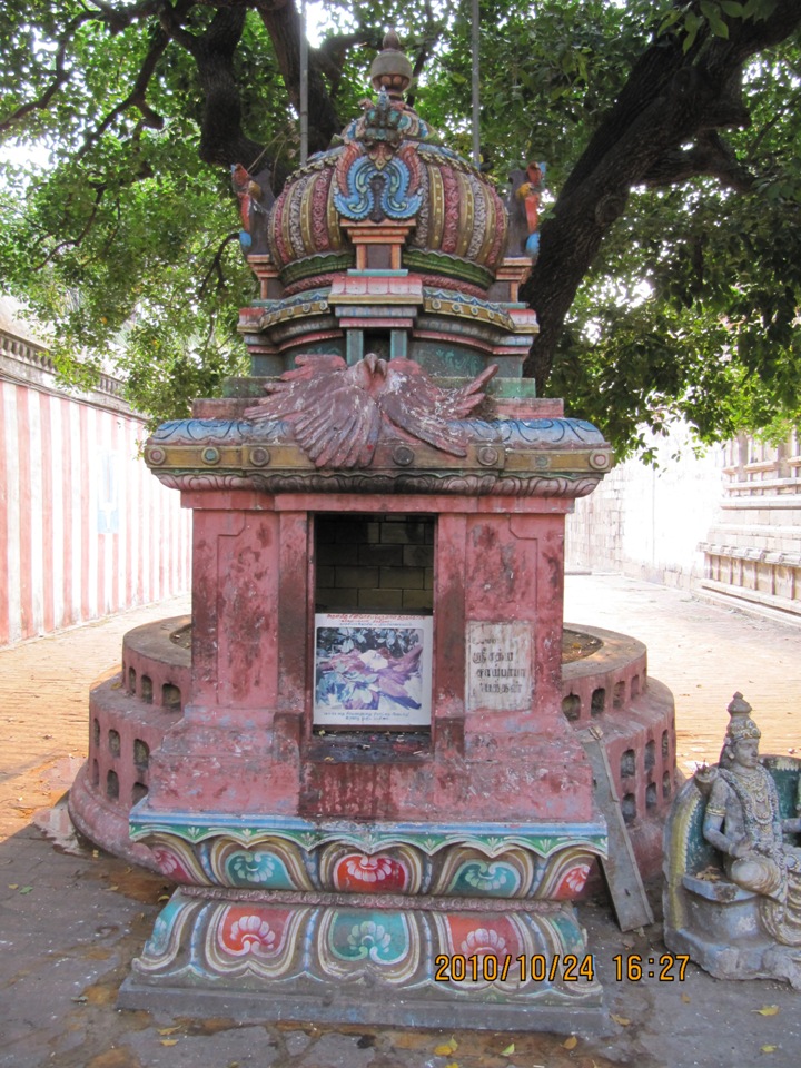 ![]() திருக்கோயில் வளாகத்தின் இரண்டாம் கோபுரத்தை அடுத்து விரியும் அரவணை அரங்கப்பையன் திருமண்டபத்தின் தென்கிழக்குச் சுவரில், இக்கோயிலுக்குப் பூசை நேரத்தில் வந்து கொண்டிருந்த இரண்டு கருடப்பறவைகள் 18. 1. 1999 தைத்திங்கள் சிரவணத்தன்று, தலமரமான மகிழமரத்திற்குக் கீழே இணையாக மோட்சமடைந்தன என்ற தகவல் எழுதப்பட்டுள்ளது. இறந்த பறவைகளின் படம் அங்கு வரையப்பட்டிருப்பதுடன், அப்பறவைகள் அடக்கம் செய்யப்பட்ட இடத்தில், 21. 1. 1999 வியாழனன்று மாலை இந்து சமய அறநிலைய ஆட்சித்துறையின் மயிலாடுதுறைப் பகுதி இணை ஆணையர் திரு. ப. தனபால் பறவைகளின் படத்தைத் திறந்து வைத்து, மோட்ச தீபம் ஏற்றி, இலட்சதீபம் கொண்டாடச் செய்தமைக்கான குறிப்பும் உள்ளது. இந்நிகழ்வின்போது கோயில் செயல் அலுவலராக இருந்தவர் திரு. எம். வேதகிரி. உதவி ஆணையராக இருந்தவர் திரு. சி. இலட்சுமணன். சுவரில் காணப்படும் ஓவியத்தை வரைந்தவர் கும்பகோணத்தைச் சேர்ந்த திரு. முத்து. ![]() இம்மண்டபத்தின் தெற்கு வாயில் வழி விரியும் இடைச்சுற்றின் தென்புறத்தே உள்ள மகிழமரத்தை ஒட்டி இறந்த பறவைகளுக்கான கருடமோட்ச நினைவகம் அமைக்கப்பட்டுள்ளது. நன்கு இதழ் விரித்த தாமரை மலர் மேல் துணைத்தளமும் நான்முக அரைத்தூண்கள் அணைத்த சுவரும் போதிகைகள் தாங்கும் உத்திரமும் தாமரை வலபியும் கபோதமும் பெற்று ஒருதள வேசர விமானமாக உருவாக்கப்பட்டுள்ள இந்நினைவகத்தின் வாயில், பக்கச் சுவர்களினும் சற்றுப் புறந்தள்ளியுள்ளது. வாயிலை ஒட்டிய தூண்களுக்கும் சுவர்த் திருப்பத் தூண்களுக்கும் இடைப்பட்ட சுவர்ப்பகுதிகள் வெறுமையான கோட்டங்களாகி யுள்ளன. கருவறையில் இறந்த பறவைகளின் ஒளிப்படம் வைக்கப்பட்டுள்ளது. முகத்தோடு முகம் சேர்ந்த நிலையில் மரத்தின் நிழலில் இருக்குமாறு போலக் காட்சியளிக்கும் அப்படம் உள்ளத்தை உருக்குகிறது. வாயிலுக்கு மேலிருக்குமாறு கபோதத்தின் தலைப்பில் பறவைகளின் சுதைவடிவக் காட்சியும் இடம்பெற்றுள்ளது. ![]() ![]() இந்நினைவகத்திற்கான கொடையாளி, தம் பெயரைத் தெரிவிக்க விழையாமல், தம்மை, 'ஸ்ரீசத்ய சாய்பாபா பக்தன்' என்று மட்டுமே அடையாளப்படுத்திக் கொண்டிருப்பது நினைவகத்தின் பெருமையை மேலும் பெருக்குகிறது. நன்றி மறவாமைக்கான நினைவகங்கள், நினைவுக்கற்கள் இவற்றைத் தமிழ்நாட்டில் பலவாகக் காணமுடிகிறது. ஆனால், தொடர்ந்து வந்த பூசைப் பங்கேற்பாளர்களுக்குக் கூட, அவை பறவைகளாக இருந்தபோதும், அவற்றின் மறைவுக்கு வருந்தி, அவை வந்து போன இடத்தில் நினைவகம் அமைத்திருப்பது புதுமையானதும் வியப்புக்குரியதுமான செயலாக அமைந்துள்ளது. இத்தகு எண்ணம் கொண்ட நல்ல உள்ளங்களையும் அந்த எண்ணத்திற்கு வடிவம் அளித்த அறநிலையத்துறை அலுவலர்களையும் வரல